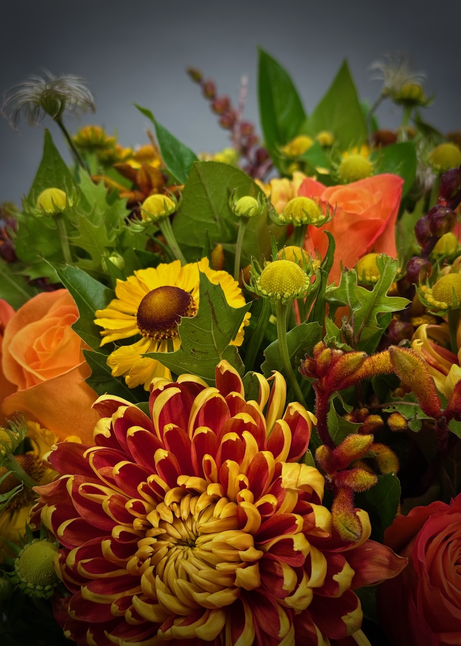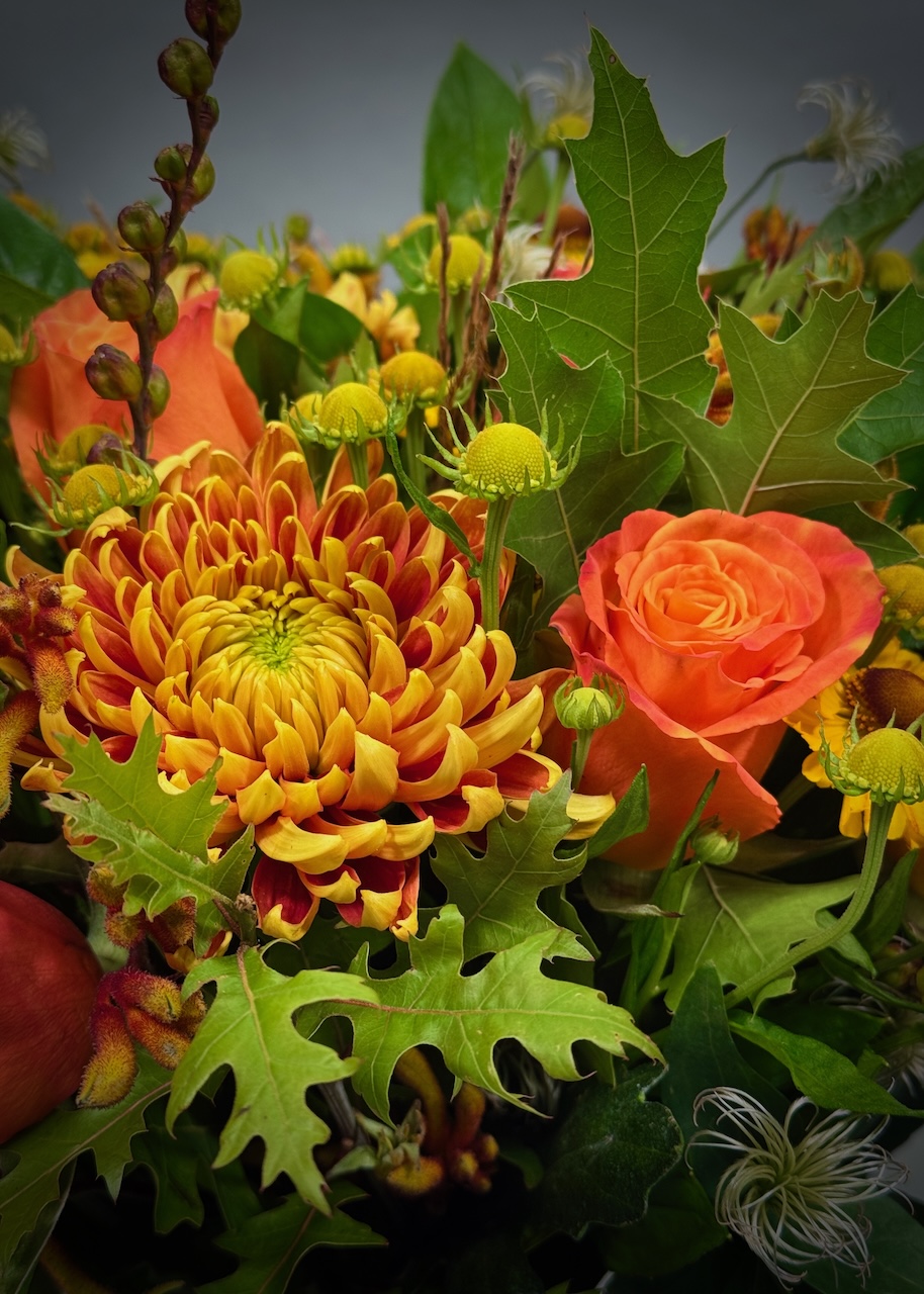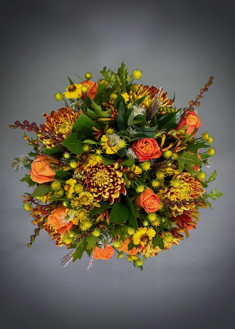 This autumnal bouquet boasts rich, vibrant tones, featuring roses, blooms, clematis seeds, helenium, kangaroo paw, crocosmia berries, and a selection of seasonal foliage.