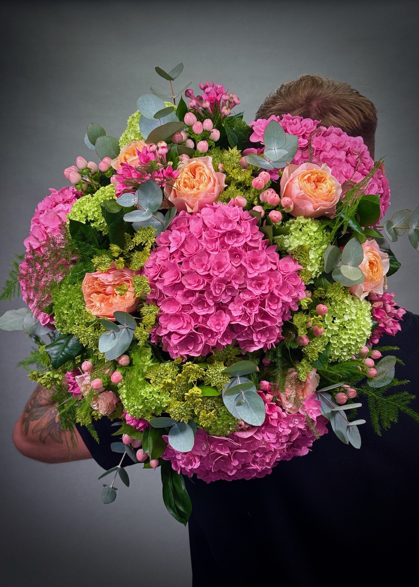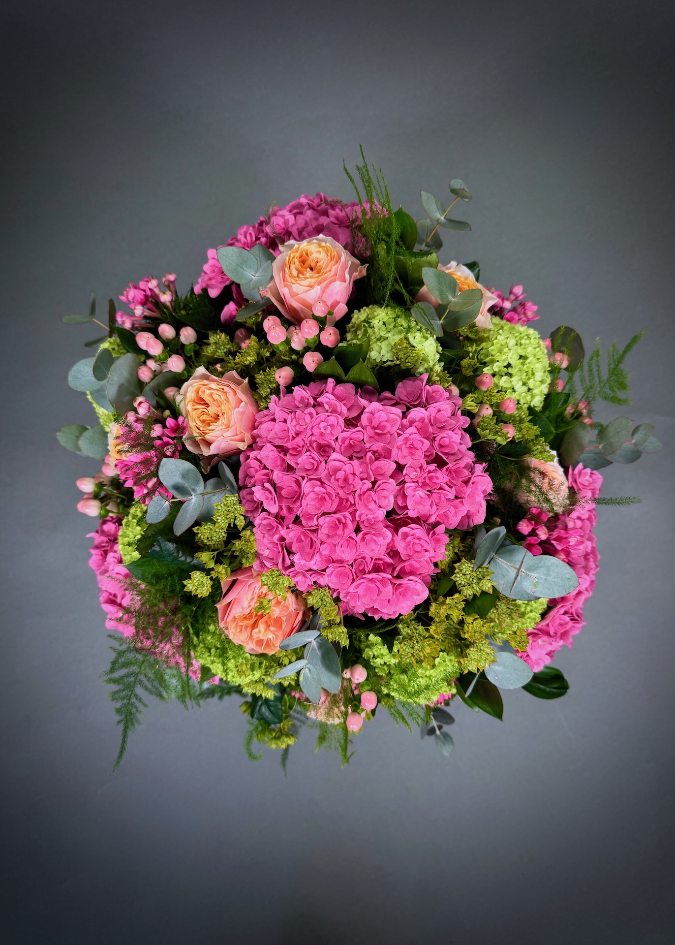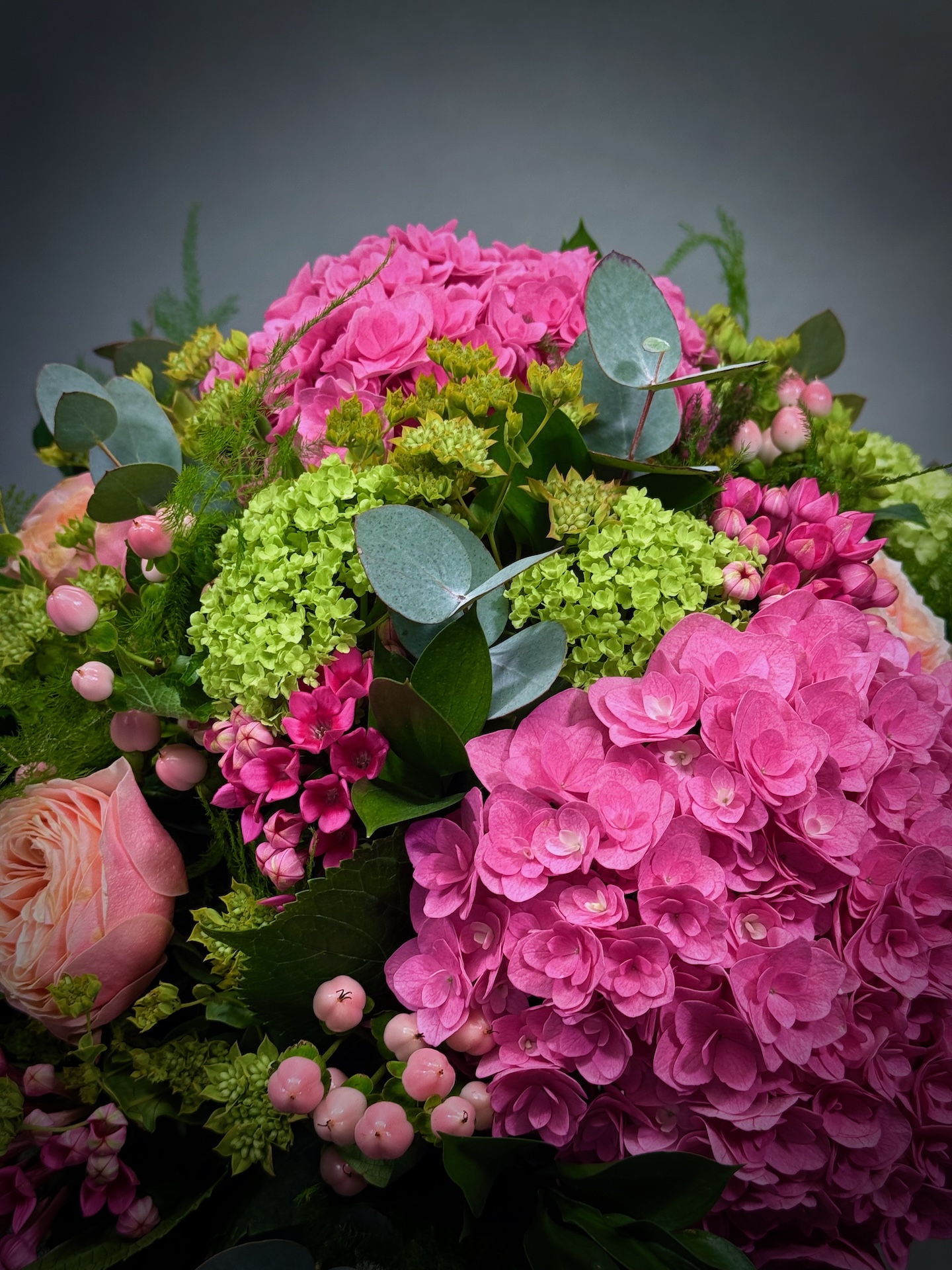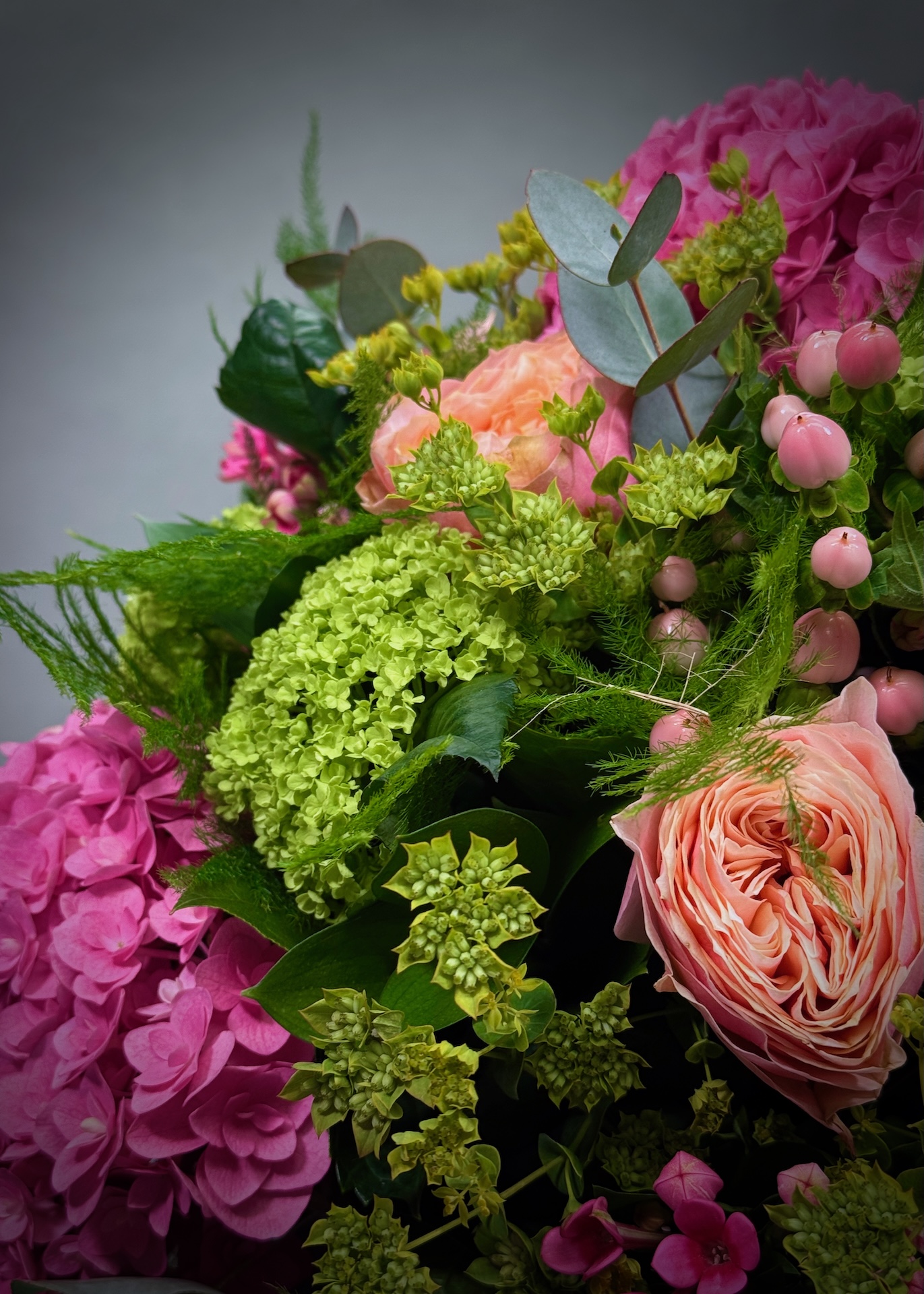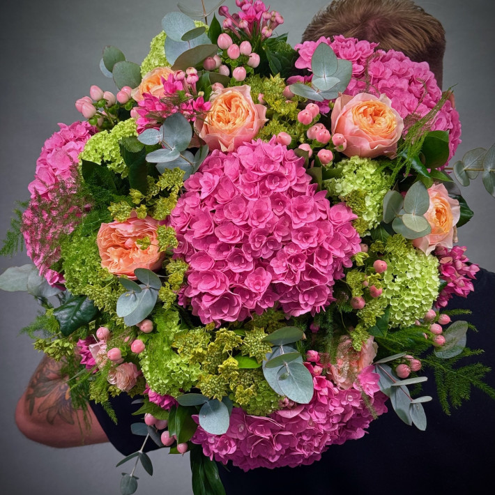This stunning bouquet is a beautiful blend of corals, roses, pink hydrangeas, hypericum berries, bouvardia, and viburnum, all complemented by a lovely selection of seasonal foliage.