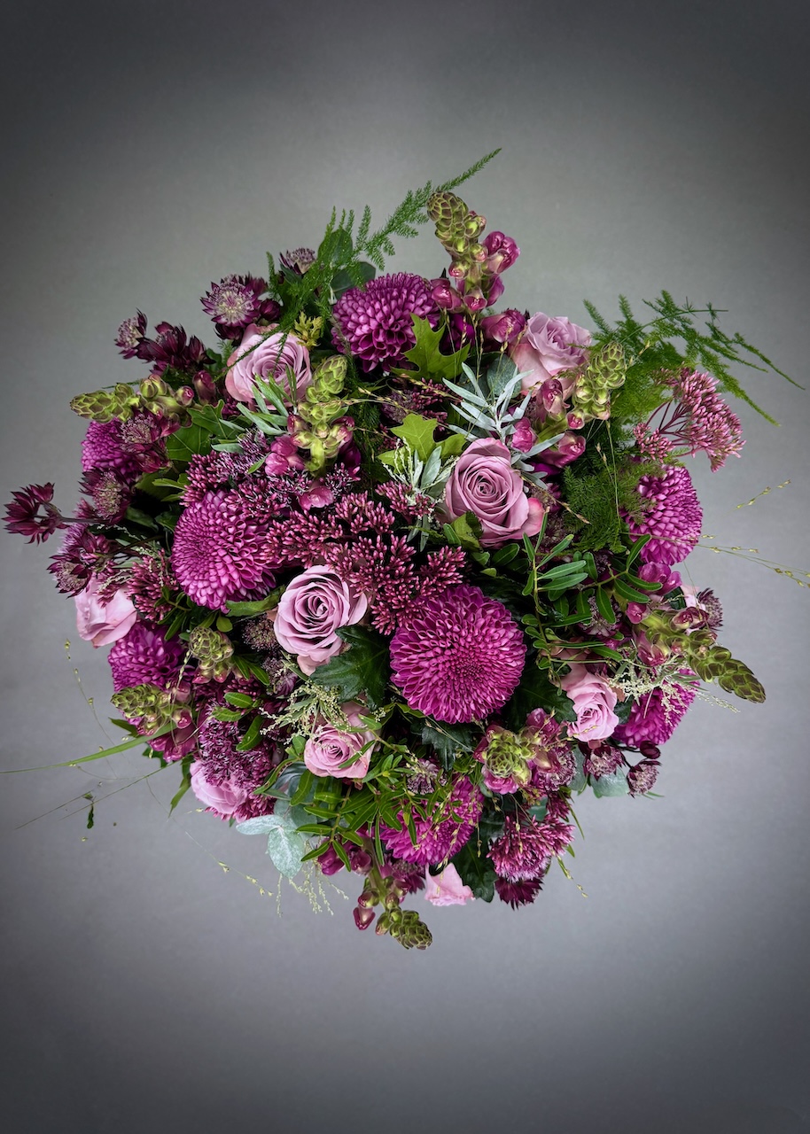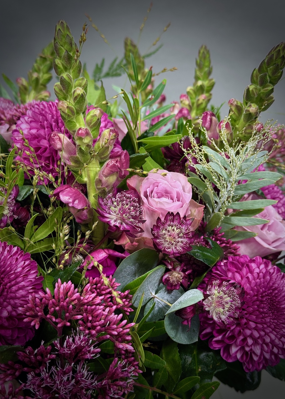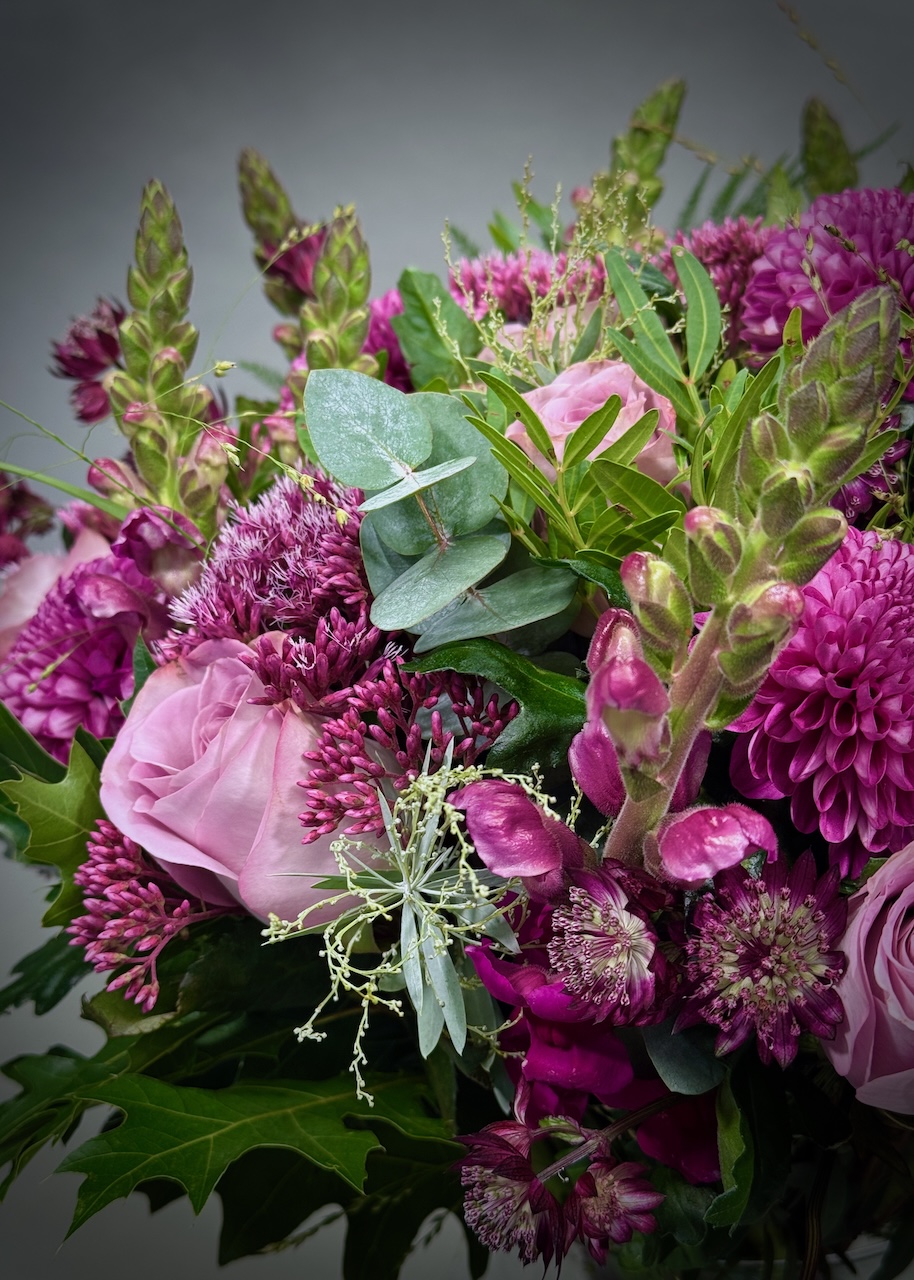 This soft and pretty bouquet is full of beautiful tones for an alternative autumn bouquet. It includes memory lane roses, antirrhinum, astrantia, blooms, eupatorium, and a lovely rich selection of foliages including berried eucalyptus.