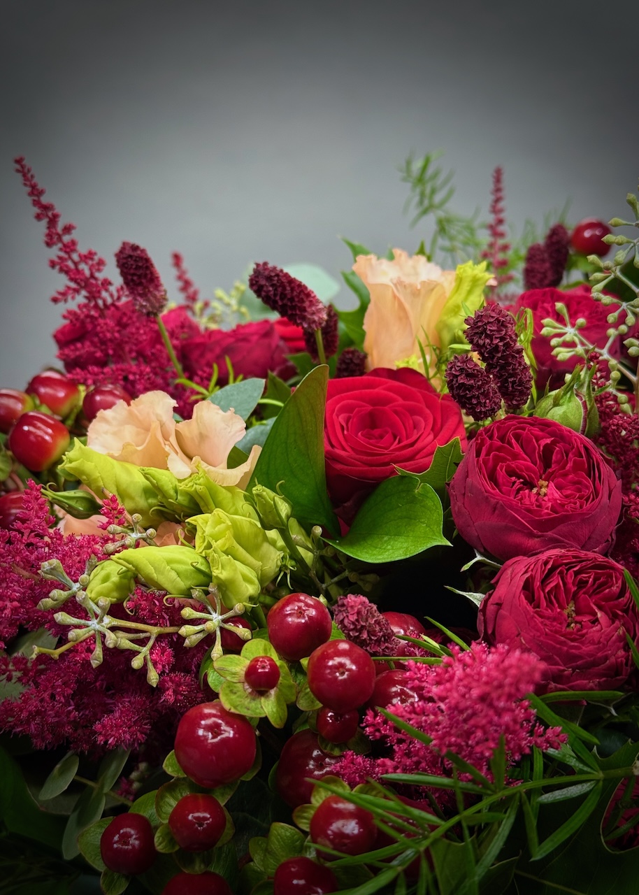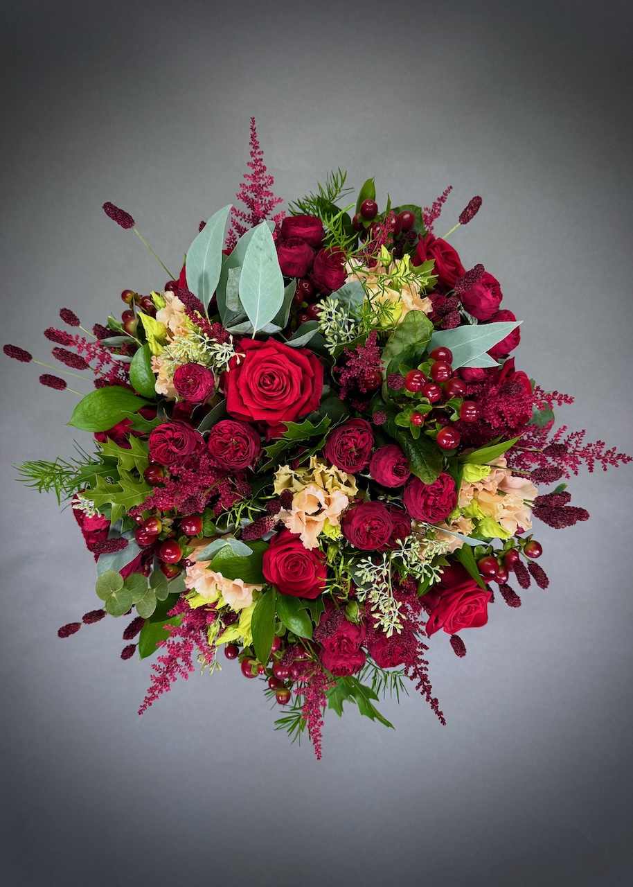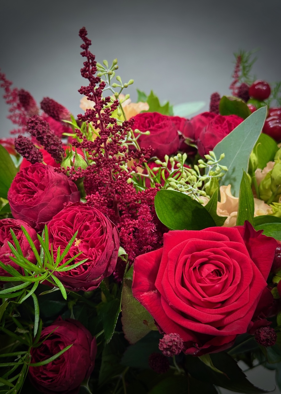 This bouquet features a rich mix of red roses, red spray roses, astilbe, hypericum, and eustoma. It also includes a lovely, rich selection of foliage, including eucalyptus and mixed grasses.