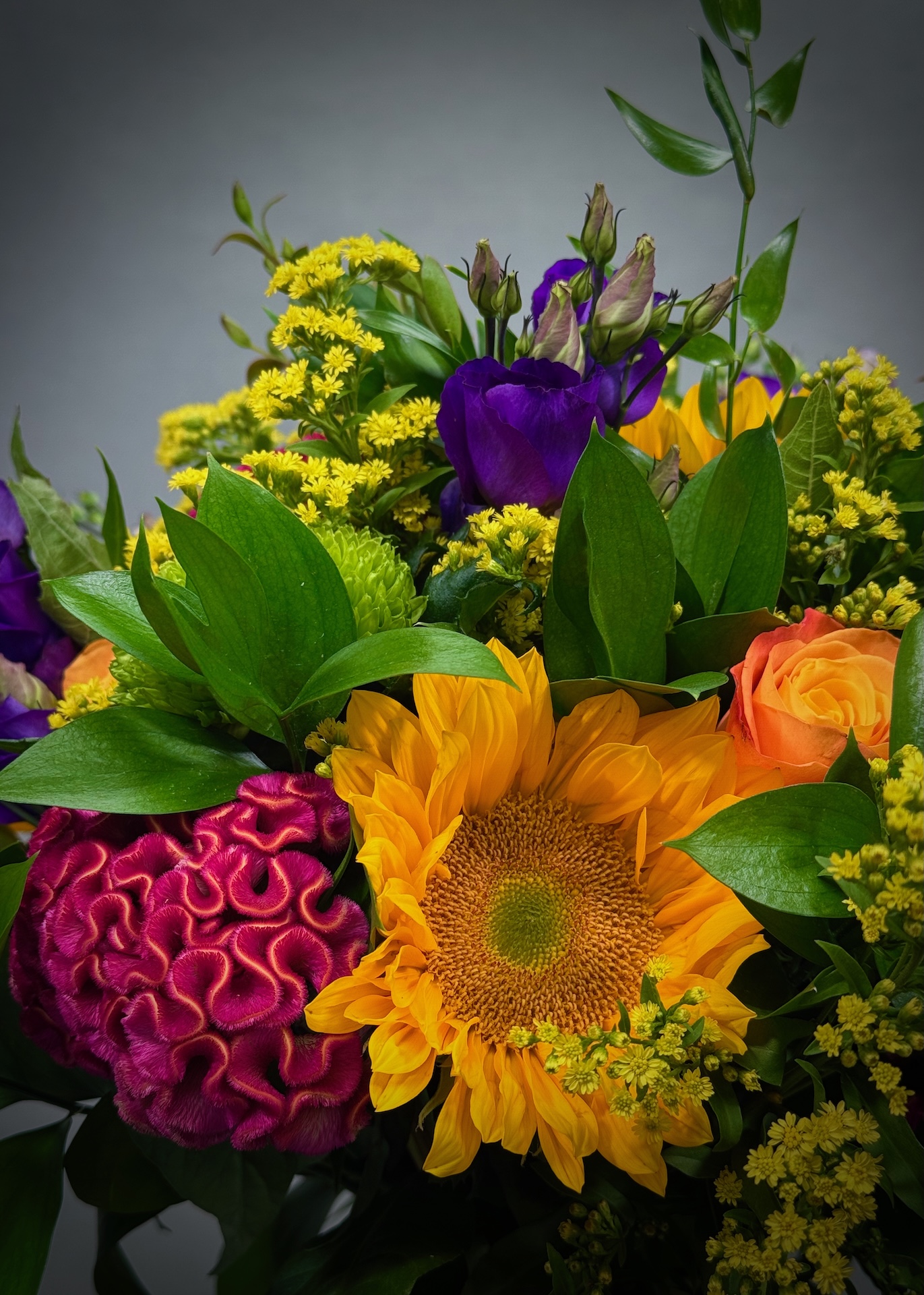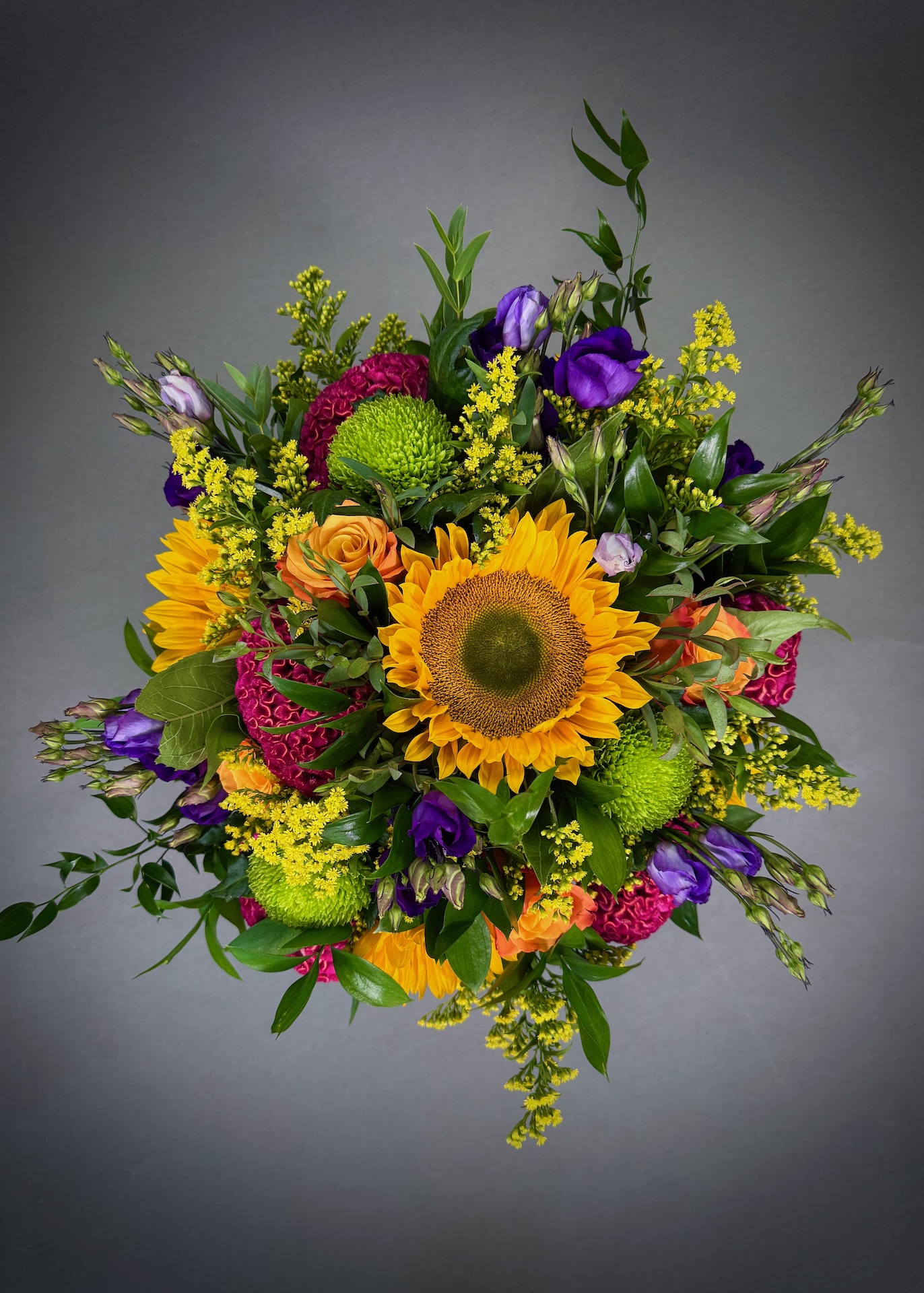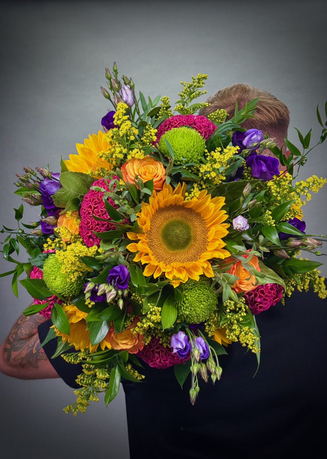 A fun and colourful bouquet sure to inject the beautiful colours of the rainbow into the home this summer. a selection of the finest blooms, including sunflowers, orange rose, blue gentiana, purple eustoma, pink bouvardia, red hypericum berry and green dianthus all set among a selection of seasonal foliage’s.